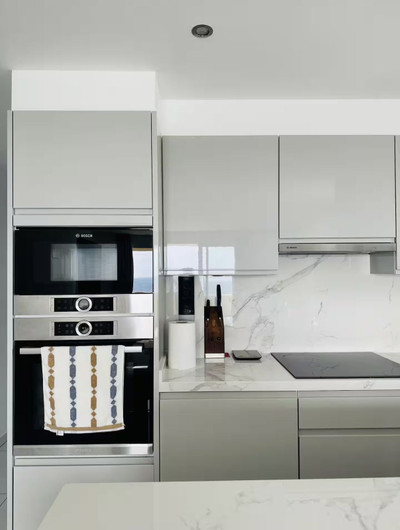 The apartment offers approximately 94 m² built, plus an 11 m² private terrace, and comprises two bedrooms, two bathrooms, an open-plan living and dining area, and a modern fully equipped kitchen. Large windows and direct access to the terrace create a seamless indoor-outdoor living experience with the Mediterranean as a constant backdrop.