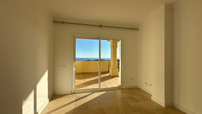 The apartment itself is finished to an excellent standard, with marble floors throughout, double-glazing for insulation, underfloor heating in the bathrooms, and integrated air conditioning for year-round comfort. The living room opens onto a private covered terrace, offering both sea and panoramic views, while glass doors allow natural light to flood the interior. The kitchen comes fully fitted and equipped, complemented by additional features such as fitted wardrobes, a storage room, and the option for bespoke furniture packages, providing flexibility for prospective owners.