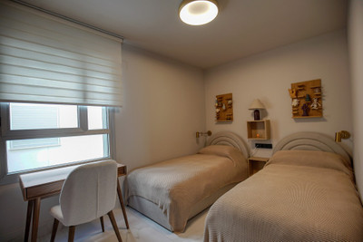 The master bedroom has an en-suite bathroom, while the two additional bedrooms share a modern family bathroom. High-quality finishes throughout, including marble floors, double-glazed windows, and central air conditioning for year-round comfort.