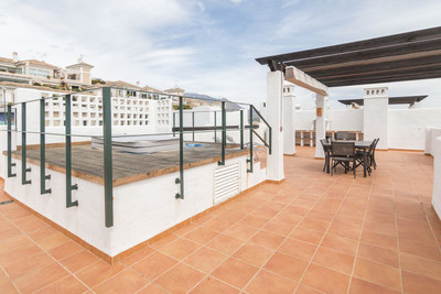 Located in a charming residential complex composed of 8 small three-story blocks, this exceptional penthouse offers a spacious living room, a fully fitted kitchen with a separate utility room, 3 bedrooms including a master suite with en-suite bathroom and direct access to the terrace, a second full bathroom, and a beautiful 47m² terrace leading to a 128m² solarium featuring a pergola and jacuzzi. From here, you'll enjoy stunning views of the golf course, the mountains, and the sea.