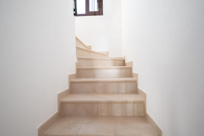 The top floor boasts a generous master bedroom with sea and mountain views, along with an en-suite bathroom featuring a shower, toilet, and sink. The master suite includes a built-in wardrobe and a bathroom with a walk-in shower, sink, toilet, and bidet. On this top floor, there is also a second spacious bedroom with an en-suite bathroom featuring a bathtub, sink, and toilet. You will also find a separate space, before reaching both bedrooms, which is being used as an office. Both the master bedroom and second bedroom open onto a wonderful, spacious terrace where you can sunbathe in privacy.