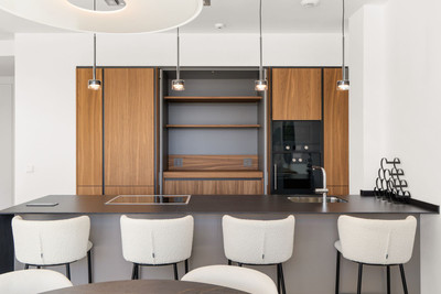 The flat offers a unique private relaxation area, designed with comfort and leisure in mind. The main terrace, located on the living room level, with a spacious chill out area, outdoor barbecue and a comfortable dining table. On the upper level is a solarium with a private infinity pool – the perfect place for morning coffee or sunset dinner.