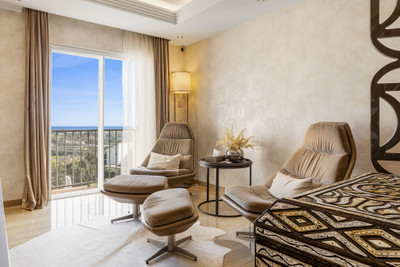Multiple terraces, including a large covered main terrace, create exceptional indoor-outdoor living, ideal for both relaxation and entertaining while enjoying the stunning views. The upper level is dedicated to the impressive master suite, featuring his-and-hers bathrooms, a large dressing area, and direct access to a private terrace. An additional en suite guest bedroom completes this floor.