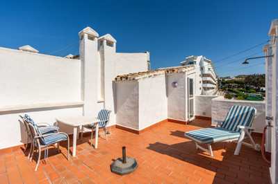 Penthouse in Calahonda in second line beach with amazing sea views and offering on two levels two bedrooms, two bathrooms, a kitchen, bright living room with sunny terrace and a roof terrace with views to the Mediterranean Sea and with sun all day. Sold furnished and equipped with AC hot and cold, marble floors and including one underground parking space. Gated complex with beautiful garden, pool and access to the wooden board walk and to the beach.