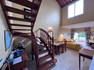 Welcome to this extremely spacious beach-side duplex penthouse, located in the ever popular Carib Playa, "Fairways" close to Cabopino & Elviria. On the main level this stunning apartment offers, 2 double bedrooms, one at each end of the apartment, the master bedroom has its own en-suite bathroom plus there is an additional full shower room servicing the second bedroom, a brand new fully fitted kitchen including new appliances, Oven, dishwasher, microwave etc. Off the kitchen there is a separate utility room housing the washing machine, tumble dryer & storage, then a split level lounge/dining area with its double height ceiling leading to the south facing double terrace with partial awning that spreads across both the lounge & master bedroom, This terrace offers lovely views of the communal gardens & pool area. back inside a wooden stair case leads up to the top floor offering yet another double bedroom with full bath & shower en-suite with a velux sky light, this bedroom also has access to its own private south facing terrace.
