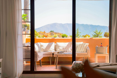 The duplex penthouse home has one of the best positions within what is a large and popular residential complex. Built on the undulating hillsides of upper Elviria, the community uses authentic Andalusian architecture to create a beautiful environment comprising of pretty paved walkways, Moorish-style water features and stunning Mediterranean gardens. The community is wonderful for those who wish to benefit from walking within the coasts natural landscape, with incredible views down through the valley of la Cala de Mijas to the sea and the impressive mountains leading all the way up the coast as far as Sierra Nevada. In the winter the snow on the peaks of the famous ski resort can be seen from the property.