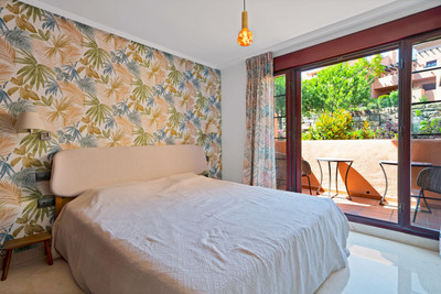 Heading back inside from here is the third bedroom, obviously benefitting very much from it's own terrace access, and with a pull-out sofa bed and fitted wardrobes. Between this and the second bedroom is the second bathroom. Again, with a walk-in shower and double wash basin formation. The second bedroom is on the other side of the la Mairena apartment. Again with fitted wardrobes and access to it's now west-facing terrace. This area is currently large enough for sun chairs and a table, however it is worth noting that the community willl allow the expansion off this terrace area by about 6 square meters, and so a significant private sun-lounger area could be easily created.