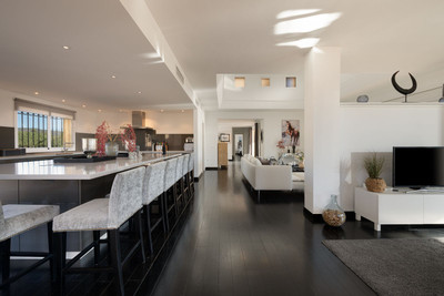 Upon entering the penthouse from either the garage or the main entrance, the private elevator opens into a welcoming foyer that leads into a bright and airy living room with soaring ceilings, creating a sense of openness and elegance. This level also includes a formal dining area, and a contemporary, open-plan kitchen equipped with high-end appliances, including a professional ice maker. A large wraparound terrace encircles the entire apartment, offering over 200 m² of outdoor space and direct access to the community pools.
