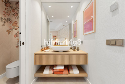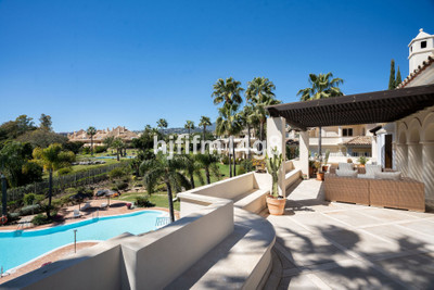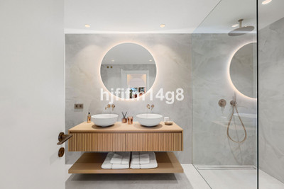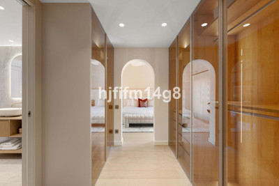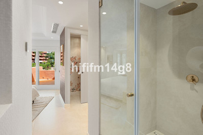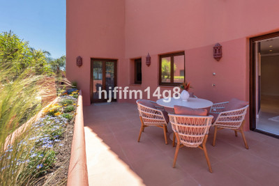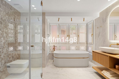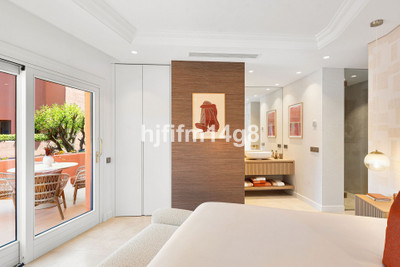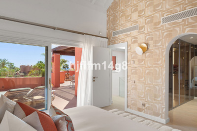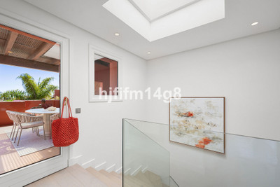 The upper level is dedicated to the impressive master suite, designed as a private sanctuary. It features a walk-in wardrobe, a luxurious en-suite bathroom, and access to its own south-facing terrace. This upper terrace offers both shaded and open-air spaces, a built-in barbecue, and breathtaking views of the Mediterranean Sea and the beautifully landscaped grounds of Torre Bermeja, making it perfect for enjoying the year-round climate of Estepona.