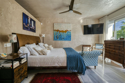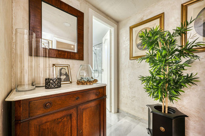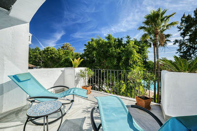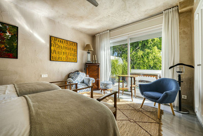 Experience the essence of tropical tranquility in this exquisite penthouse duplex in Guadalmina Baja, set amidst lush landscaped gardens and soothing water features. Meandering pathways wind through vibrant palms and exotic blooms, leading to a gentle stream filled with koi fish and lily pads, infusing the air with calm and natural harmony. Designed by a renowned landscape architect, the gardens open out to a turquoise lagoon with inviting sunbathing areas and a pool bar — perfect for relaxing with family, enjoying a refreshing drink, or simply unwinding in nature’s embrace.