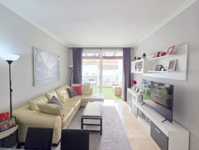***Stunning Duplex Penthouse in Fuentes de la Duquesa*** Located in the highly sought-after Fuentes de la Duquesa, this beautifully presented 2-bedroom, 2-bathroom duplex penthouse offers the perfect blend of privacy, sunshine, and coastal living. Located just a short stroll from the lively Duquesa square with its selection of bars and eateries, and only 15 minutes on foot to the vibrant Duquesa Marina, this home is ideally positioned to enjoy the best of both worlds. The entrance leads to a spacious, well-appointed kitchen with a separate utility room. The open-plan living area is bright and inviting, with patio doors leading out to a southeast-facing terrace, offering tranquil views of Duquesa Golf. A stunning marble staircase takes you up to the mid-level, where you'll find two generously sized bedrooms, each with built-in wardrobes and private balconettes. The master suite boasts a beautifully refurbished en-suite bathroom with a sleek walk-in shower, while the family bathroom is stylishly designed to complement the space. Continue upstairs to the exceptional roof terrace—an entertainer’s dream—with panoramic views that stretch across the coastline, creating the ultimate spot to unwind and enjoy the Mediterranean lifestyle. The property is being sold partially furnished, with the added benefit of secure, gated communal parking. This is an opportunity not to be missed for those looking to embrace the charm of this vibrant part of the coast. Come see for yourself and discover your perfect retreat in Duquesa!