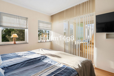 The master bedroom is exceptionally spacious and features a walk-in wardrobe and an elegant en-suite bathroom. Two additional guest bedrooms share a stylish bathroom. Both the master bedroom and one of the guest bedrooms enjoy direct access to the terrace, enhancing the connection between indoor and outdoor living.