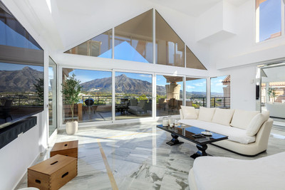 Discover one of the most spectacular vantage points in Nueva Andalucía with this rare 3-bedroom penthouse in the Magna Marbella development. Positioned in an elevated location, this residence boasts unrivalled panoramic views of La Concha mountain, the lush fairways of Los Naranjos & Las Brisas Golf Courses, and the sparkling Mediterranean Sea — a truly breathtaking backdrop from dawn to dusk.