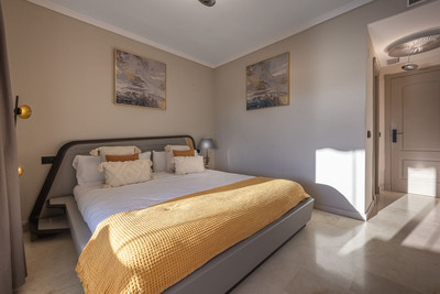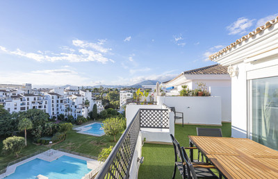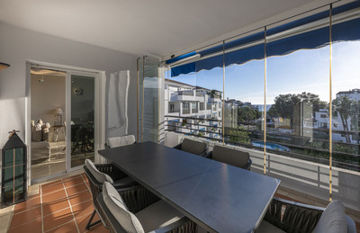 Welcome to Marbella.Imagine waking up every morning with the gentle Mediterranean breeze caressing your face and the promise of a new day in one of the most exclusive enclaves in the world.This luxurious duplex, located in the vibrant heart of Puerto Banús, is not just a property: it is a haven of elegance, serenity and style.From the moment you step inside, you will be dazzled by the exquisite décor, where every detail has been carefully chosen to create a unique visual and sensory experience.The spacious and bright rooms open naturally to the outside, allowing the southern light to flood every corner.On the main floor, the fully equipped separate kitchen is an ideal space for both enjoying fine dining and sharing special moments.Adjacent to it, the living room offers an atmosphere of absolute comfort, perfect for relaxing after a day enjoying the charms of Marbella.On this same level, two bedrooms guarantee rest and privacy:• A master suite with a king-size bed, private bathroom and a cosy glazed balcony where silence and calm reign supreme.• A second bedroom with two single beds and a full bathroom, designed for the comfort of family or guests.Climbing the elegant staircase, you discover the true treasure of the property:a spacious master suite with direct access to the upper terrace.From there, the sea views are a changing spectacle that accompanies every sunrise and every sunset.