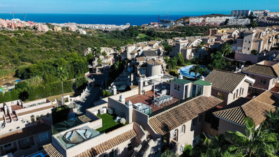 The open-plan living area flows effortlessly onto a private terrace, where panoramic views stretch across the landscape and beyond. An impressive solarium provides additional outdoor space — ideal for entertaining or unwinding — complete with an outdoor kitchen and jacuzzi for enjoying the warm Spanish evenings in total privacy. in addition you get to enjoy communal swimmingpools in plural and lush, wellkept gardens, throughout the urbanisation.