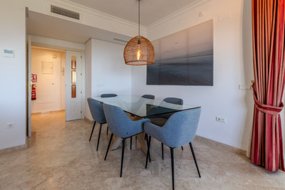 This penthouse, situated on the top floor, is accessible via an elegant entrance hallway that leads into a large, square living room. This expansive space includes both dining and sitting areas, complemented by a charming open fireplace. Direct access to the generous terrace enhances the living area, offering the perfect space for relaxation and al fresco dining, all while enjoying those captivating coastal views.