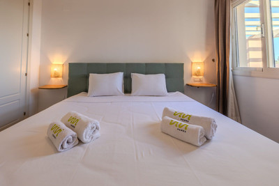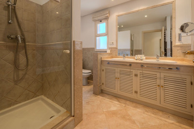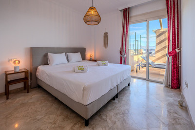 The master bedroom is both spacious and elegant, featuring direct access to the terrace, a large walk-in dressing room, and a luxurious en-suite bathroom with a walk-in shower and a bathtub with an additional shower overhead. The 2 other bedrooms are well-sized, with fitted wardrobes, and is served by an adjacent bathroom equipped with a large walk-in shower.