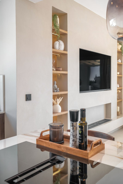 The custom-designed kitchen forms the heart of the home, finished with premium materials and integrated high-end appliances. Carefully selected textures and warm tones create an inviting yet sophisticated atmosphere throughout the residence.