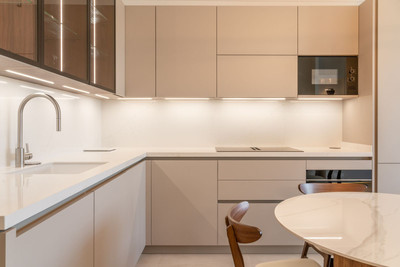 Inside, the residence has been completely reimagined with a bespoke interior design and full furniture installation, marrying contemporary sophistication with a sense of warmth. Commissioned artwork and handmade curtains lend individuality and refinement, while new fitted carpentry provides discreet, seamless storage. The main reception space is anchored by a feature-lit television wall with integrated surround sound, a striking focal point that perfectly balances modern design with everyday comfort.