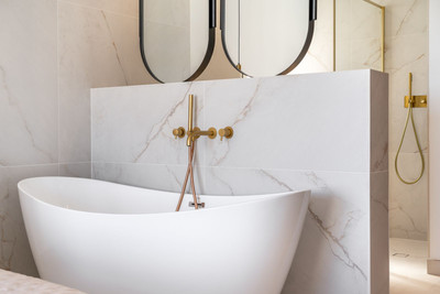 The master suite is conceived as a sanctuary, where a dramatic freestanding bath has been purposefully positioned to embrace sweeping views of both sea and landscape. Each bathroom is completed with luxurious Italian tiling, underscoring the property’s refined aesthetic.