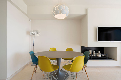 A bright and spacious open-plan living and dining area, seamlessly connected to the terrace