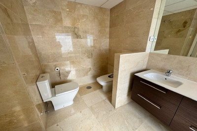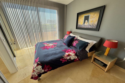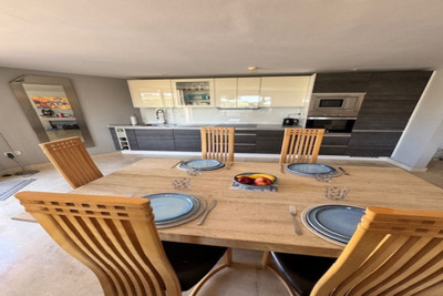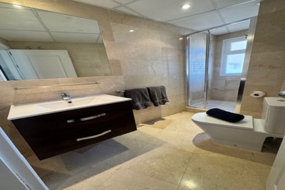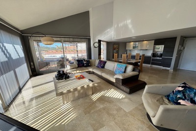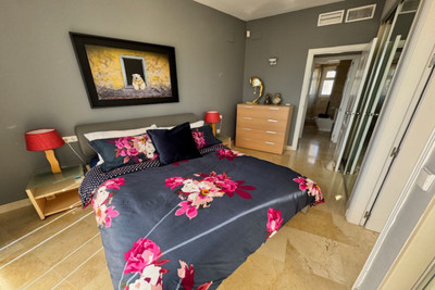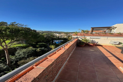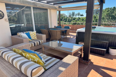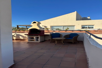 This bright unusually large 2 bedroom luxury, south facing penthouse is situated within the exclusive, beautifully kept, luxury complex in Riviera del Sol next to the prestigious Miraflores Golf Club House.The property consists of a very large lounge/diner, a fully fitted open plan kitchen, 2 double bedrooms, 2 bathrooms (one en-suite) and a large wrap around terrace which boasts lovely views of golf, mountains and the community gardens.The lounge boasts beautiful large floor to ceiling glass patio doors on 2 sides and the master bedroom has large mirrored fitted wardrobes as well as patio doors leading onto the terrace. This apartment is finished to a high standard, with marble flooring throughout, fully tiled marble bathroom, air con (H&C), video entry phone, Satellite TV, alarm etc. This peaceful complex has beautiful, very well maintained tropical gardens which includes a water / pond feature. It also has a large pool with bar prep area, a separate children's pool, a gymnasium and sauna. The apartment comes with underground parking space and storage.
