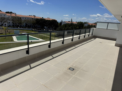 The penthouse has a modern design and offers top-quality materials and finishes. The open-plan living room with a fully equipped kitchen looks out onto a large terrace overlooking the garden and pool. The penthouse comes with a parking space and a storage room, included in the price.