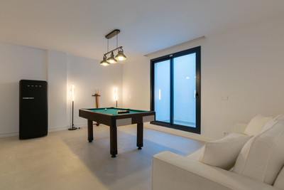 The property offers 180 m² of built space, a 32 m² terrace and a 111 m² private plot. The main floor is centred around an open-plan living and dining area with large windows and direct access to the outdoor spaces, creating an easy connection between the interior, the covered terrace and the garden. The kitchen, with its central island and clean modern lines, reinforces the home’s bright, functional and social character.