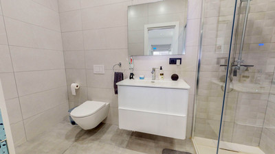 The upper floor comprises three bedrooms and two bathrooms. The master bedroom includes an en-suite bathroom and a very sunny open terrace with panoramic views.