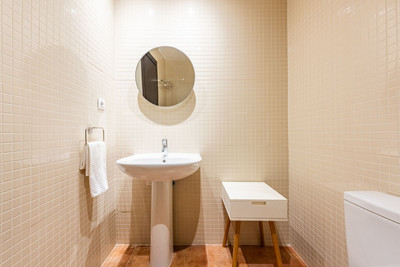 Descending from the entrance level, you will find a full bathroom that serves both as a guest bathroom and as the bathroom for the fourth bedroom, which is located in a more private area of the home—ideal for guests seeking additional independence.