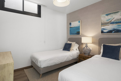 The ground floor’s contemporary kitchen allows for sociable cooking experiences, with easy interaction across the open-plan living spaces. The lower level features two bedrooms sharing a bathroom, cleverly designed to benefit from ample natural light and fresh air. This level also includes a dedicated TV lounge, perfect for quiet evenings or family entertainment.