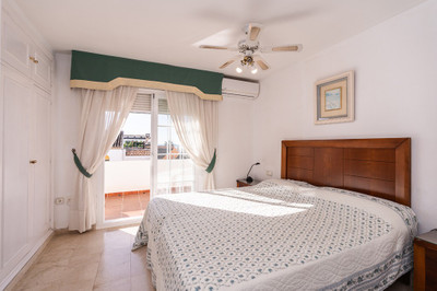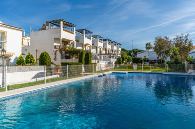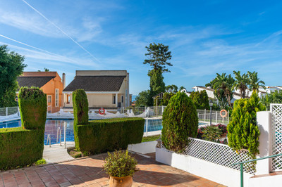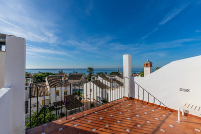 Ample and bright semi-detached house in the urbanisation Costabella in East Marbella. The house offers on two levels three bedrooms, three bathrooms, a good sized living room, big kitchen, front terrace and back summer terrace. Amazing sea views from first floor and from roof terrace. The house offers great potential as there is a basement that could be converted into more bedrooms or whatever you like. Amazing complex within a couple of steps from the beach with large pool area, garden and parking space area. Marbella Centre is only a 10 minute drive away.