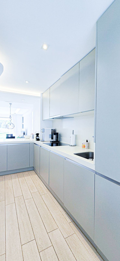 Premium Kitchen:Sleek resin worktops, high-end appliances.