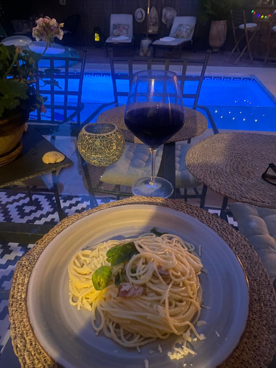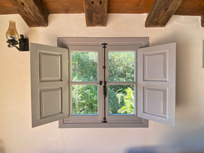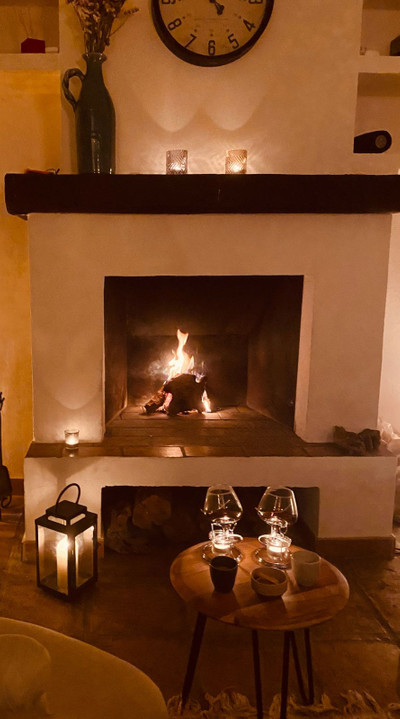 Around the pool is a chill-out area with sun loungers, an outdoor kitchen with a barbecue, and a bar area. Traditional elements such as terracotta floors, solid wood doors and windows, and beamed ceilings characterize the architecture of this charming house.