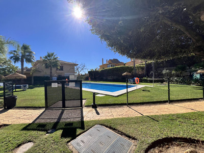 The communal areas include two swimming pools, one of which is open year-round, as well as a barbecue area with tables. Garden maintenance is included in the community fees.
