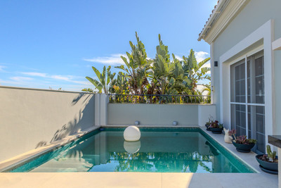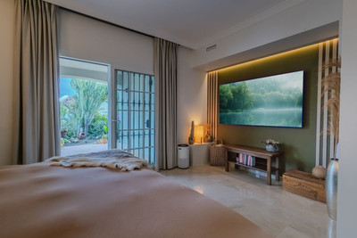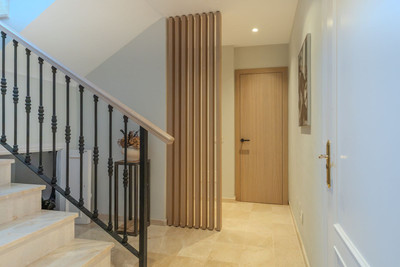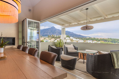 Elegant View Residence in La Cerquilla, Nueva Andalucía Located in the prestigious and secure gated community of Aldea Dorada, this semi-detached residence offers the ease of a townhouse with the elevated presence of a penthouse, set in one of Nueva Andalucía’s most exclusive and tranquil locations. From its privileged position, the property enjoys exceptional panoramic views across the Mediterranean Sea, the Golf Valley, and the iconic La Concha Mountain—widely considered among the finest views in Nueva Andalucía and the defining feature of the home. Behind a classic Andalusian façade, the interior reveals a warm and refined Japandi-style renovation, featuring high ceilings, open-plan living spaces, and modern bathrooms that create a calm and elegant atmosphere. The entrance level offers an open living and dining area with a striking suspended fireplace, a discreet office space, and direct access to a partly covered terrace designed to fully embrace the views. The home offers 300 m² built, 76 m² of terraces, and a 300 m² private garden with avocado, mango, and passion fruit trees. A plunge pool on the upper terrace delivers a true penthouse-style outdoor experience. The property comprises four bedrooms and three bathrooms, with excellent potential to create a luxurious master suite with walk-in wardrobe and en-suite bathroom. Additional features include a private gym, two large storage rooms, covered parking for two cars, and lower-level terraces with direct access to the garden. A rare opportunity for buyers seeking a secure, semi-detached luxury home with breathtaking views and effortless maintenance.