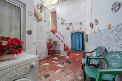 Outdoor living is a standout feature. From the dining area, you access a private terrace with an outdoor bathroom, a large cave, and an upper storage room. Stairs lead to a vast open roof terrace boasting pleasant views over the village rooftops and distant mountains.