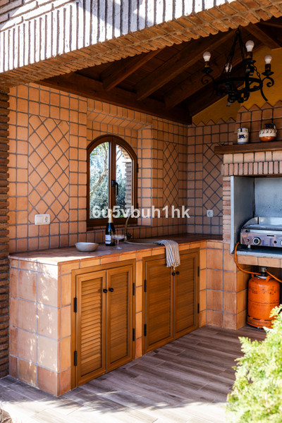 The exterior is equally impressive. At the entrance, there are two covered barbecue areas—one traditional and one gas-powered—each complete with its own sink. Parking is plentiful, with covered space for two large vehicles and additional open parking for guests.