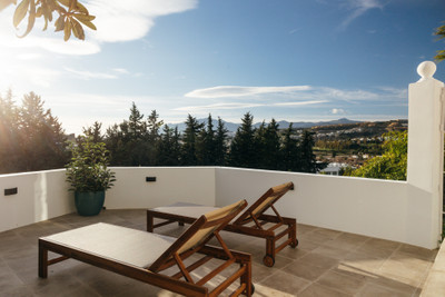 The master bedroom opens directly onto a private outdoor chill-out area with sun loungers, lush greenery, and a tranquil ambiance—your own secluded retreat to fully embrace the Costa del Sol lifestyle.