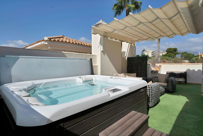 With over 300 m² built area, the property features 3 bedrooms, 2 bathrooms, and a guest toilet. The generous living and dining area opens onto a west-facing terrace overlooking the communal gardens and pool. The bright, fully equipped kitchen complements the home’s spacious layout, while the private rooftop solarium — complete with a jacuzzi — provides the perfect spot to relax and enjoy panoramic views.