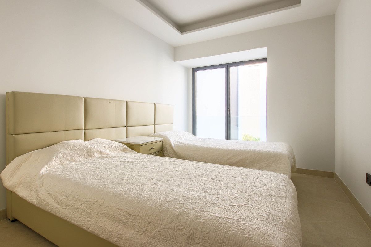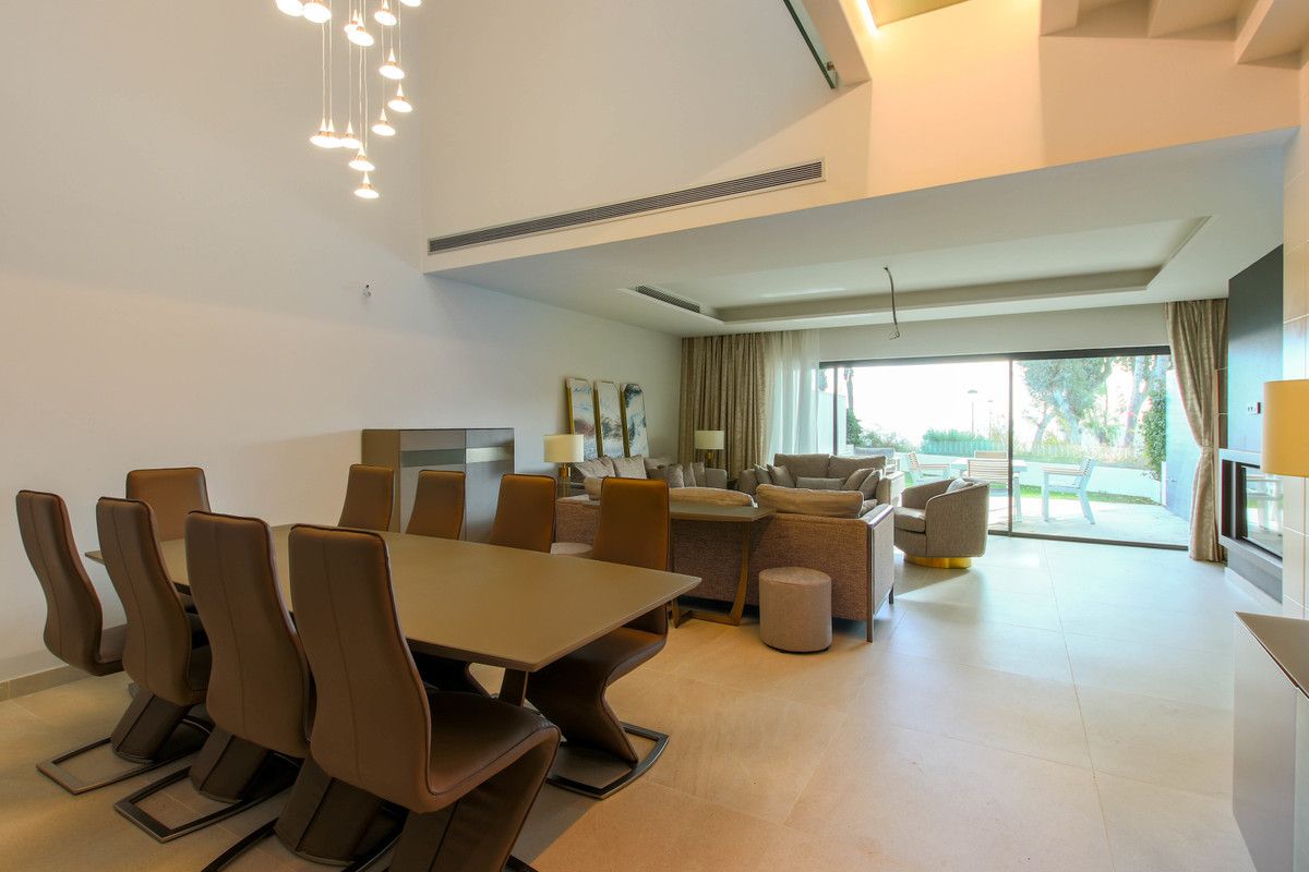Modern and luxurious townhouse with 4 bedrooms brand new on the beachfront on the New Golden Mile of Estepona, being only twenty minutes from Puerto Banús and Marbella. The community has beautiful tropical gardens, swimming area, with a fifty-meter Olympic pool, and a spa circuit with sauna and Turkish bath. The house has a private roof terrace with fantastic sea views, jacuzzi and barbecue area, large living room with fireplace, fully equipped kitchen. It is equipped with underfloor heating, air conditioning hot / cold, security shutters and double glazing.