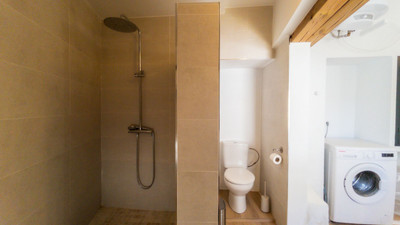 The spacious yet cozy living room is the warm heart of the house, featuring a fireplace and a fully equipped open kitchen with bar. The bright, modern bathroom offers every luxury with a stylish double sink vanity, a spacious walk-in shower, a semi-separate toilet, and a washing machine.