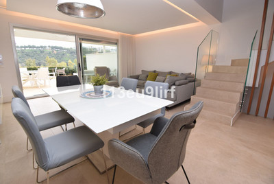 Luxury townhouse located in a private gated urbanisation of only 40 exclusive properties with communal pool and landscaped gardens, perfectly integrated into the environment. Private basement with garage and storage room with direct access to the house. Open plan ground floor with kitchen, living room, cloak room and a large terrace and private garden. The first floor offers the master bedroom with en suite bathroom and separate dressing area. Another two ample and bright bedrooms share a second bathroom. Large solarium on the top floor. Luxury finishes, led lighting, fully equipped fitted kitchen, air conditioning, designer bathrooms, bedrooms with motorized blinds, safe and fully lined wardrobes. Energy rating B, solar panels for hot water supply, excellent soundproofing and thermal insulation. Situated in La Cala Resort, offering a unique lifestyle concept with three superb championship courses, a golf academy, an award-winning retreat hotel and one of the most complete and luxurious spa centres in Spain. There are also three restaurants, each of them with its own character as well as an additional wide range of sporting facilities such as tennis and padel courts, fitness lessons and running circuit. 24 hour security patrol within the resort.