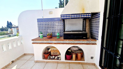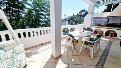 Partially renovated townhouse in Mijas with panoramic views. Spread over 3 floors, it features 3 bedrooms, terraces on every level, a solarium, modern kitchen, and BBQ terrace. Community pool & gardens included. Peaceful location just 5 minutes from town!