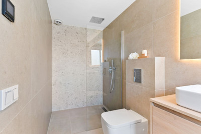 The top floor boasts sloped ceilings and an additional sea-facing balcony with southwest orientation, offering partial views of the Mediterranean. Currently configured with two additional rooms (ideal as bedrooms or offices), plus a stylish bathroom with walk-in shower.