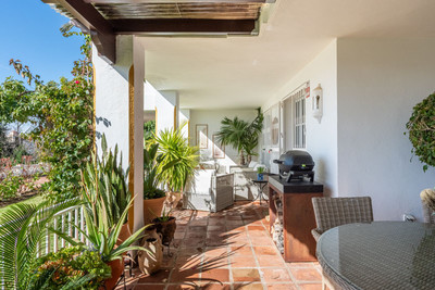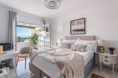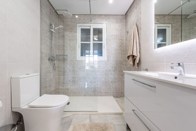 On the first floor, the master bedroom enjoys its own en-suite bathroom, accompanied by two additional guest bedrooms, both with en-suite bathrooms. Two of the bedrooms open onto a sunny terrace, while the living room connects to a large covered terrace with sea views.