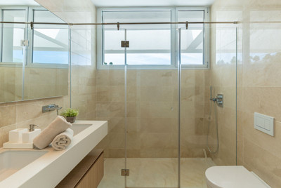 The master suite is located on the first floor and includes built-in wardrobes, an en-suite bathroom and its private terrace. Further there are 2 guest bedrooms with built in wardrobes, which overlook the gardens, and 1 bathroom. All bathrooms have custom made cabinets under the sink.