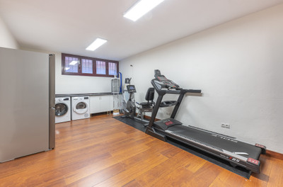 The basement level includes a bedroom with en-suite bathroom, a gym, laundry room, storage space, and direct access to the garage, which offers a private parking space.